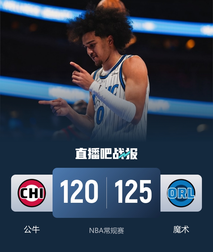 开场后公牛外线率先发难取得领先,小瓦格纳接连拿分为魔术咬住比分,魔术在首节尾声掀起一波攻势完成反超。第二节上来魔术连续制造犯规,他们通过罚球守住领先,公牛一直紧追不舍,上半场两队打成平手。易边再战,公牛率先发力打出9-0攻势,随后布莱克内突外投为魔术吹起反扑号角,虽然特雷·琼斯状态火热频频拿分,但魔术全面开花还是将比分追上,第三节两队再度战成平手。最后一节两队依旧打得十分胶着,吉迪帮助公牛取得微弱优势,贝恩毫不示弱做出回应,并且用一记三分帮助魔术反超比分,随后魔术打出8-0的小高潮建立领先,此后公牛努力追分,但魔术将领先守到最后,最终魔术125-120击败公牛取得3连胜,公牛遭遇4连败。