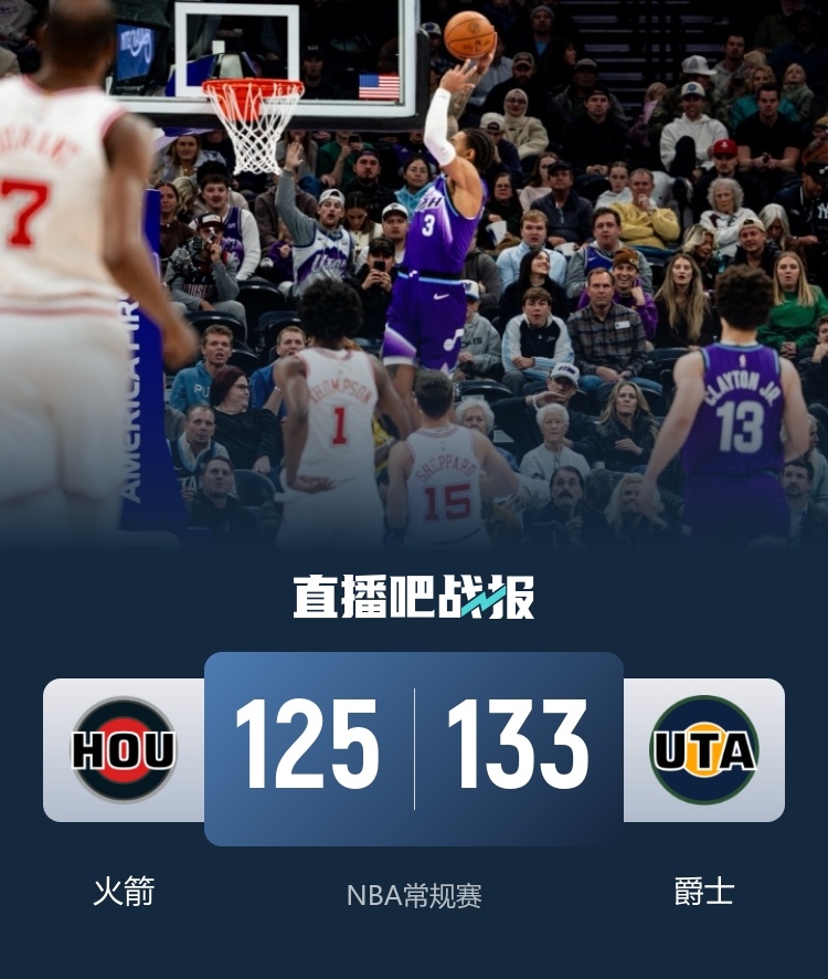 比赛开始,火箭开局慢热近3分钟一分未得,申京和小贾巴里连续外线发炮止血,阿门连续突破,双方展开对攻战,比分多次打平,次节双方继续对攻,基昂特·乔治里突外投连砍9分带队建立主动权,半场爵士领先到11分。下半场,杜兰特连续中投追分,但努尔基奇连续内线空篮回应,乐福和菲利波夫斯基外线也连续发炮,爵士领先到20分以上,但最后2分钟火箭12-0重新追到个位数分差,末节双方继续拉锯战,杜兰特里突外投带领火箭一度追到差1分,但乔治和马尔卡宁接连三分稳住优势,随后爵士牢牢掌握住两球以上领先,阿门致命失误,最终爵士133-125复仇火箭。